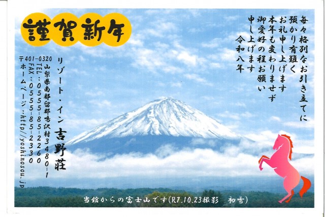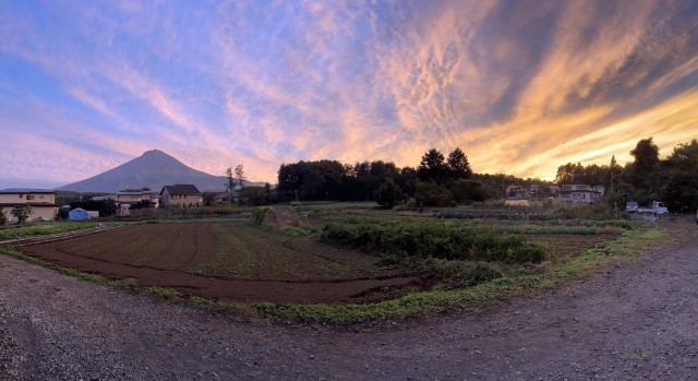 昨日の夕焼けがすごくきれいでした。当館の裏側(和室のお部屋)から見える景色となります。パノラマ機能で富士山と夕日を撮影してみました。実際はもっと夕焼けが明るかったです。だんだん寒くなり富士山の紅葉も始まっています。雪が降る時期は日々違う富士山の姿が見えます。